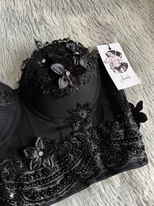 Bustier con bordado de pedrería y aplicaciones florales en 3D, una pieza elegante y poderosa.
